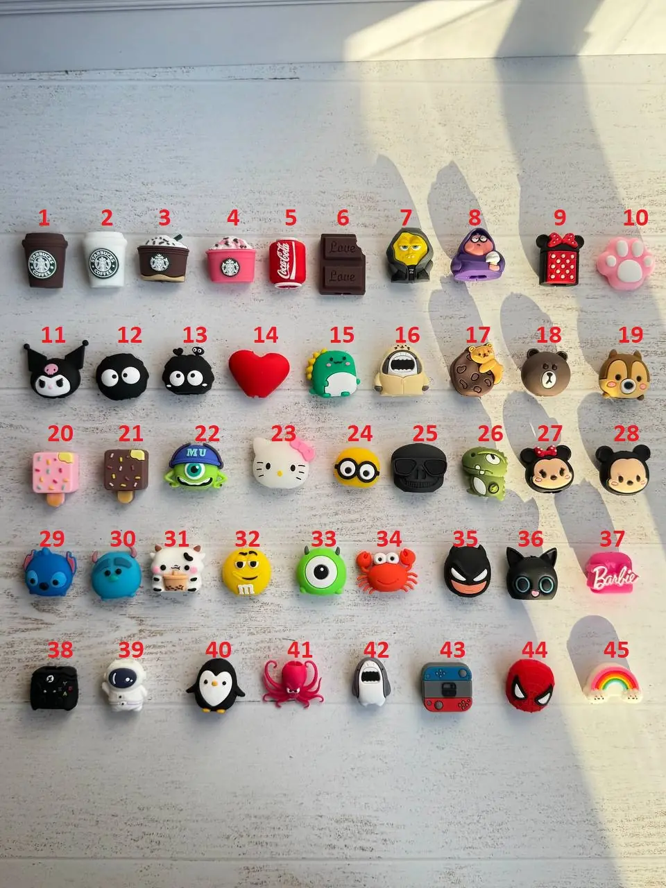 45-ابر رنگین کمان ,38-دسته ایکس باکس ,5- کوکاکولا ,37-باربی ,36- گربه چشم تیله ,23-هلوکیتی ,22-مایک کلاه دار ,21-بستنی چوبی قهوه ای ,16-کوسه هودی دار ,17-خرس بیسکویتی ,44-اسپایدرمن ,19-سنجاب ,2-استارباکس لیوانی سفید ,20-بستنی چوبی صورتی ,35-بتمن ,10-پنجه صورتی ,11-کرومی ,12-هپل ساده ,13-هپل شاخ دار ,14-قلب ,15-بچه دایناسور ,8-پاتریک گنک ,7-باب گنگ ,1-استارباکس لیوانی قهوه ای ,26-دایناسور برقی ,25-اسکلت ,34-خرچنگ ,33-بچه مایک تک چشم ,32-ام اند ام ,31-گاو ,30-سالیوان ,3-فراپاچینو قهوه ,29-استیچ ,28- چهره میکی موس ,9-مینی موس خال خالی ,27- چهره مینی موس ,4-فراپاچینو توت ,6-شکلات ,24-مینیون دو چشم ,39-فضانورد ,40-پنگوئن ,41-هشت پا ,42-کوسه طوسی ,43-نینتندو ,18-خرس قهوه ای |